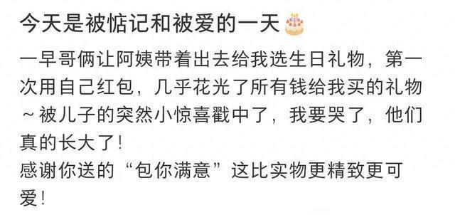 原来两个儿子一大早就瞒着她,让阿姨带着出去给自己选生日礼物,而且是第一次哥俩用自己过年得的红包,几乎花光了所有钱买的这个礼物。 两个儿子的心意,作为妈妈的刘云感动的都要哭了,感叹兄弟俩真的是长大了,心里满是欣慰。